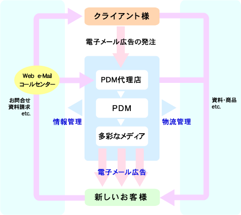 これは、情報発信から、情報の受け口→情報や物の保管→郵便・物流発送処理まで、一環したダイレクトマーケティングに必要な設備・ネットワークを保有しているPDMグループならではのフルフィルメントサービスです。